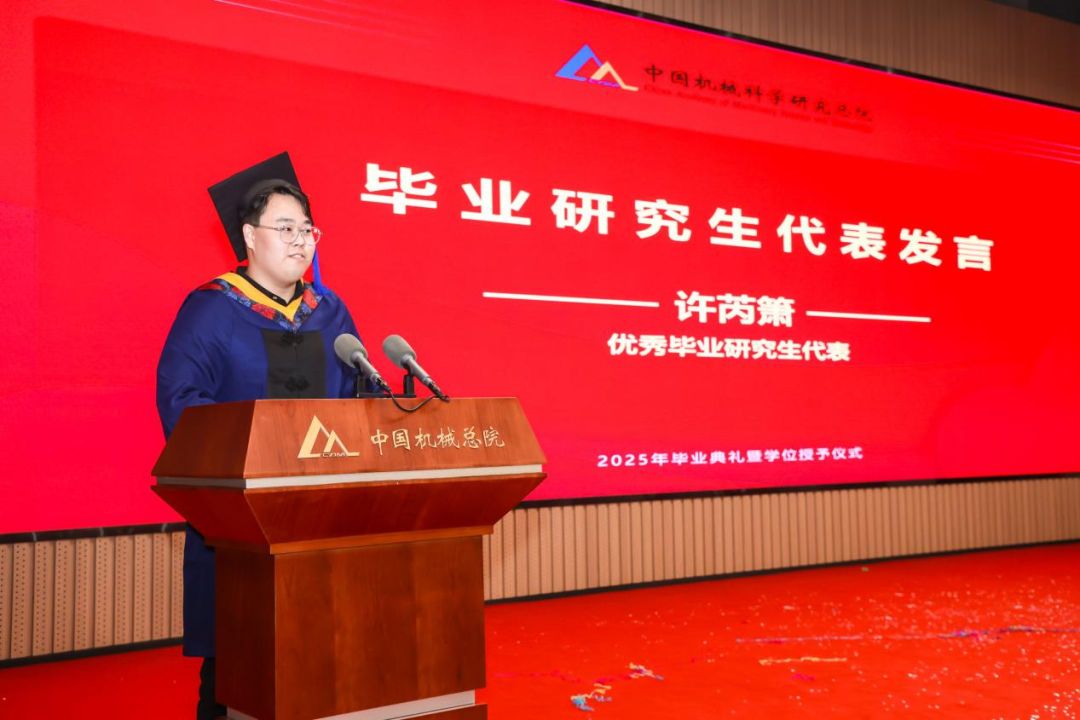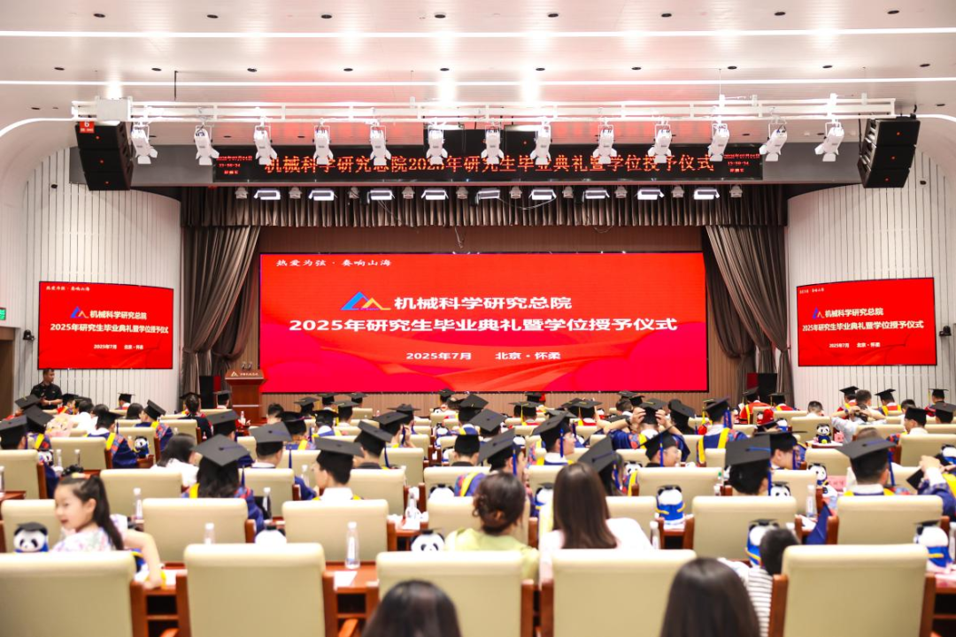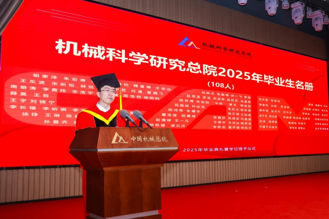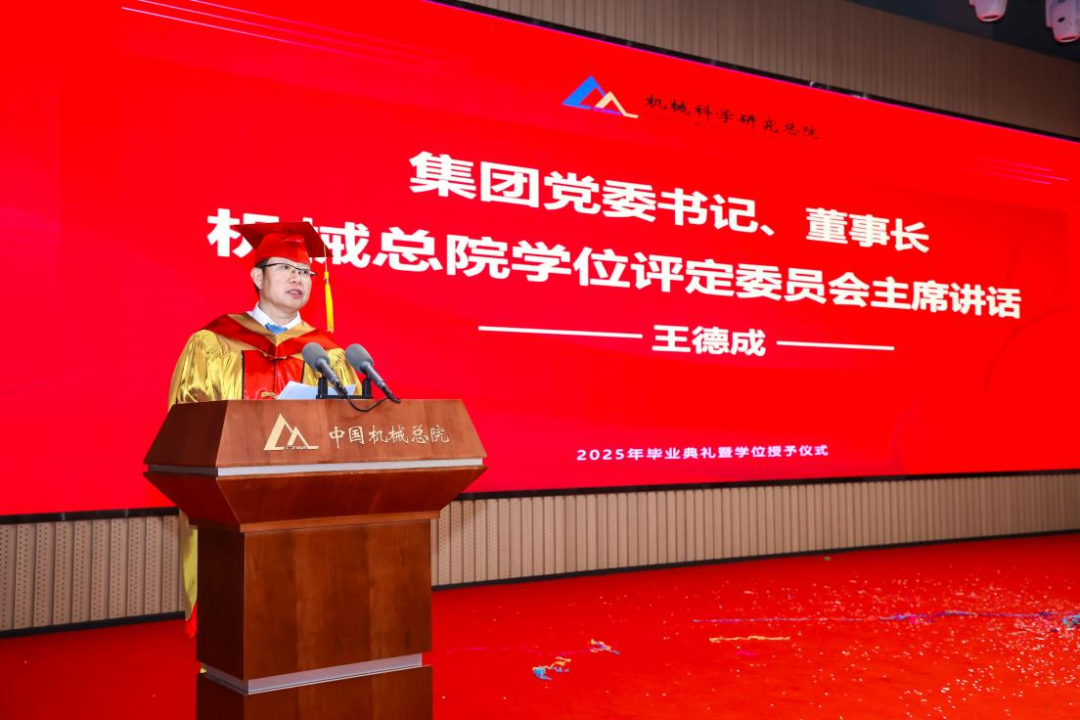 機械總院學位評定委員會主席、集團黨委書記、董事長王德成,集團黨委副書記、總經理孟祥宇,集團黨委副書記、董事李玉鑫,集團黨委委員、副總經理王宇,機械總院學位評定委員會副主席、集團副總經理李愛國,集團副總經理姜超出席典禮,機械總院學位評定委員會委員、京內外各二級單位領導、導師代表、研究生管理部門負責人、2025屆畢業生及家屬共計190余人齊聚一堂,共同見證這一重要時刻。典禮由機械總院學位評定委員會秘書長、研究生院副院長邊翊主持。